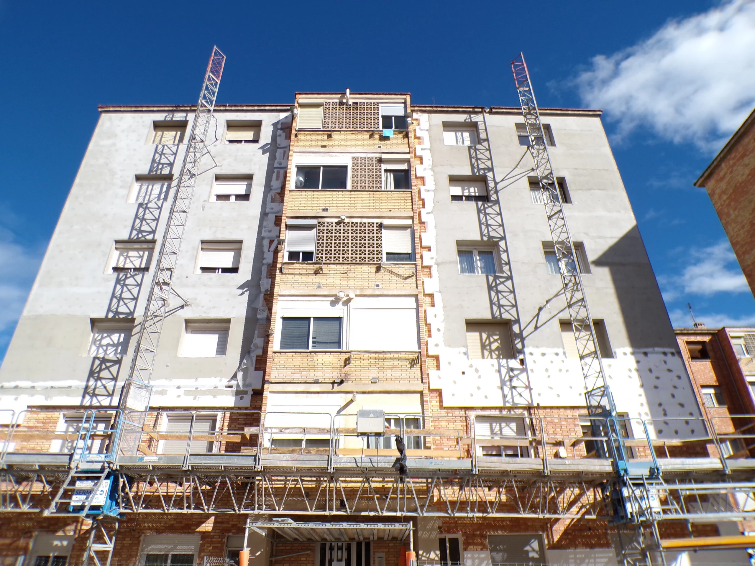 Esta distribución permite cubrir una amplia superficie del edificio y facilitar los trabajos iniciales de rehabilitación, como actuaciones en fachada, reparaciones estructurales y otros trabajos en altura, de forma simultánea y segura.